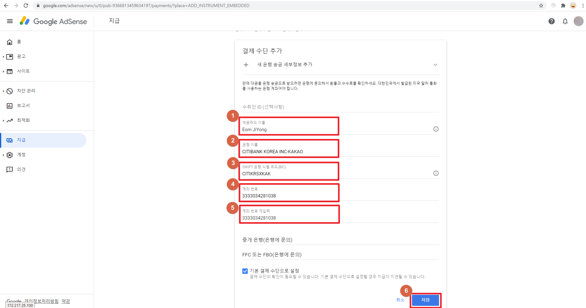 예금주의 이름, 은행 이름, SWIFT 은행 식별 코드(BIC), 계좌번호 이렇게 4가지 항목을 입력하고 저장하면 끝입니다!!