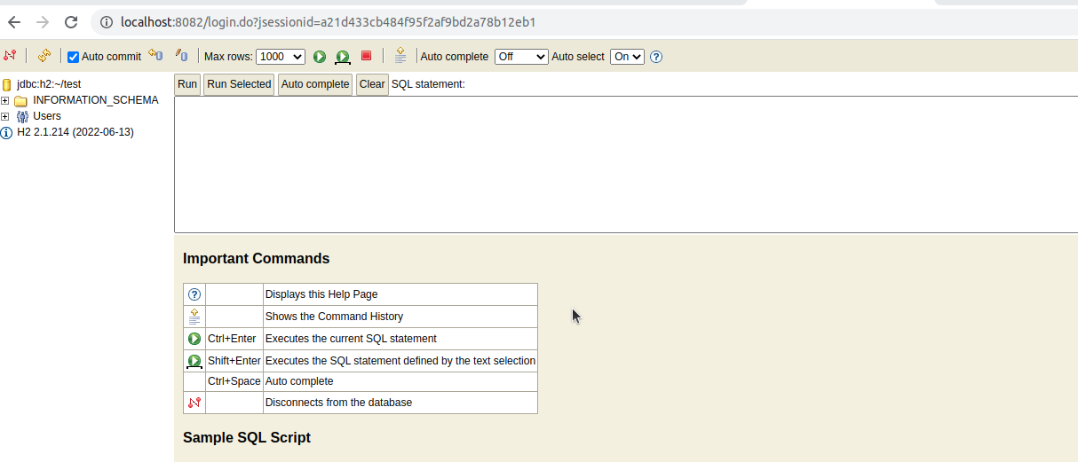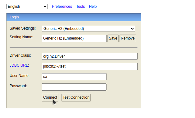 파일을 생성한 후에, localhost:8082로 접속하였고 [Connect] 버튼을 클릭하였다.