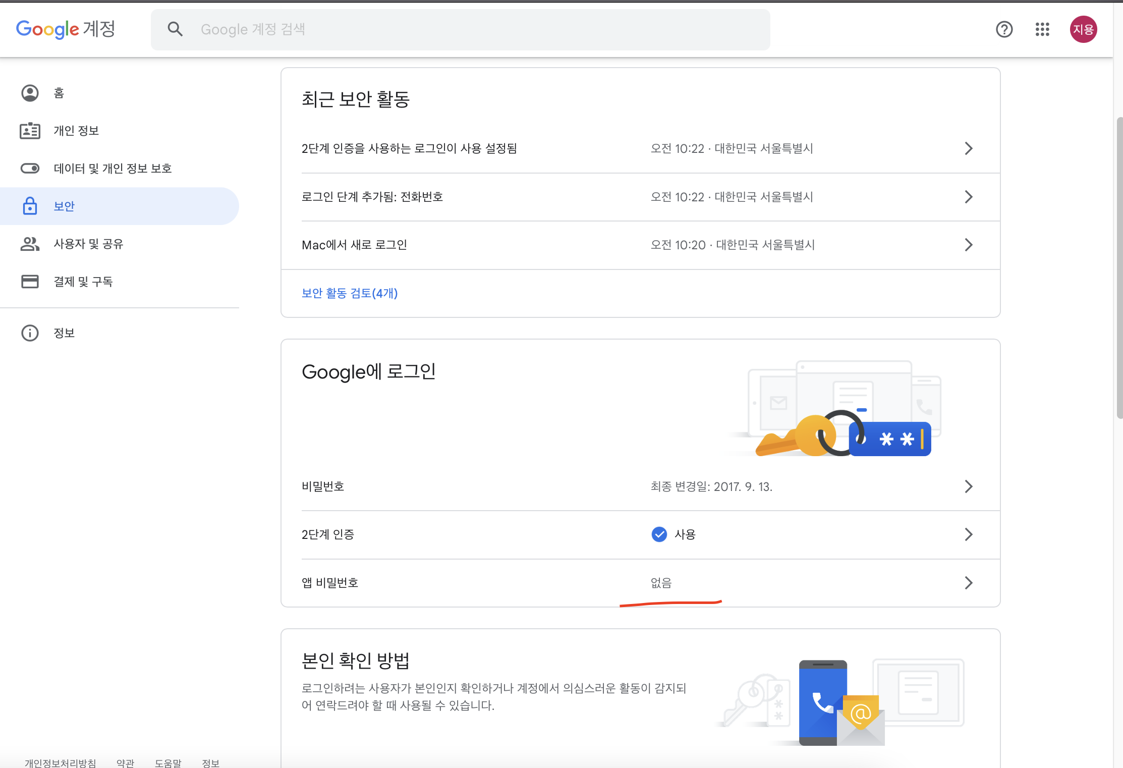 그리고 나서 "앱 비밀번호"를 클릭한다.