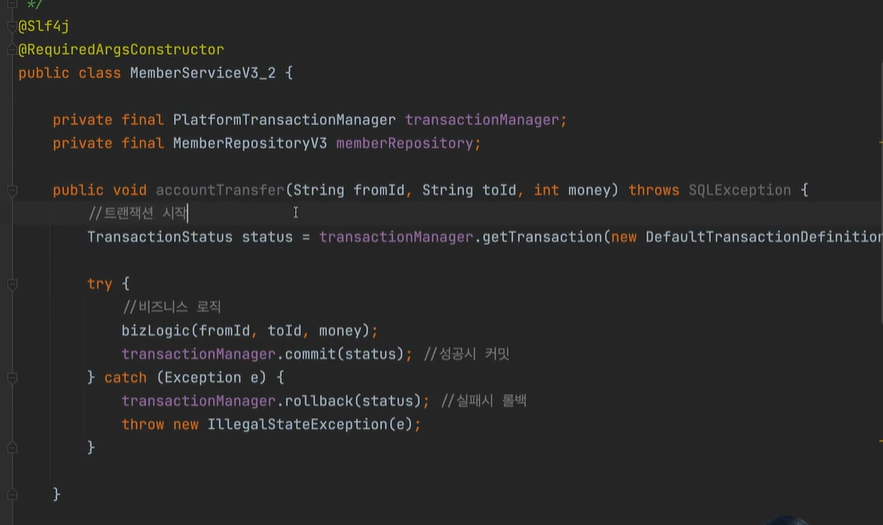 - 하지만 이곳은 서비스 로직인데 비즈니스 로직 뿐만 아니라 트랜잭션을 처리하는 기술 로직이 함께 포함되어 있다.