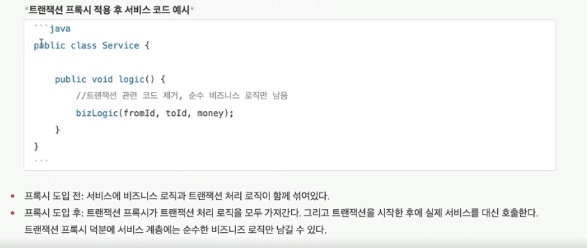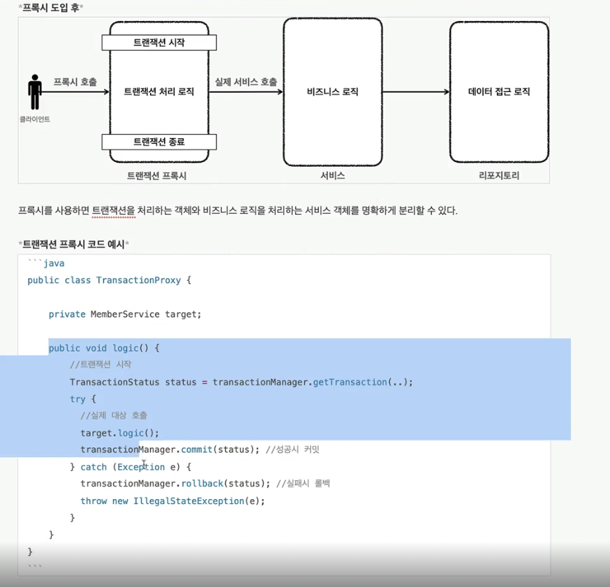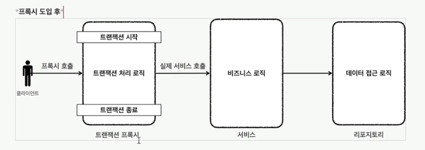 프록시를 사용하면 트랜잭션을 처리하는 객체와 비즈니스 로직을 처리하는 서비스 객체를 명확하게 분리할 수 있다.