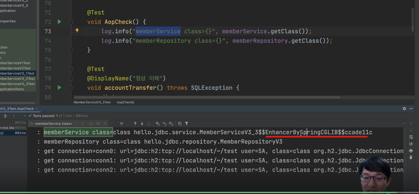 @Transaction이 적용되어 있는 서비스를 호출하게 되면 EnhancerBySpringCGLIB 이런식으로 클래스 이름이 변경되게 되는데, @Transactional 을 선언하게 되면 스프링에서 약간의 조작을 통해 해당 Service를 상속 받게 된다.