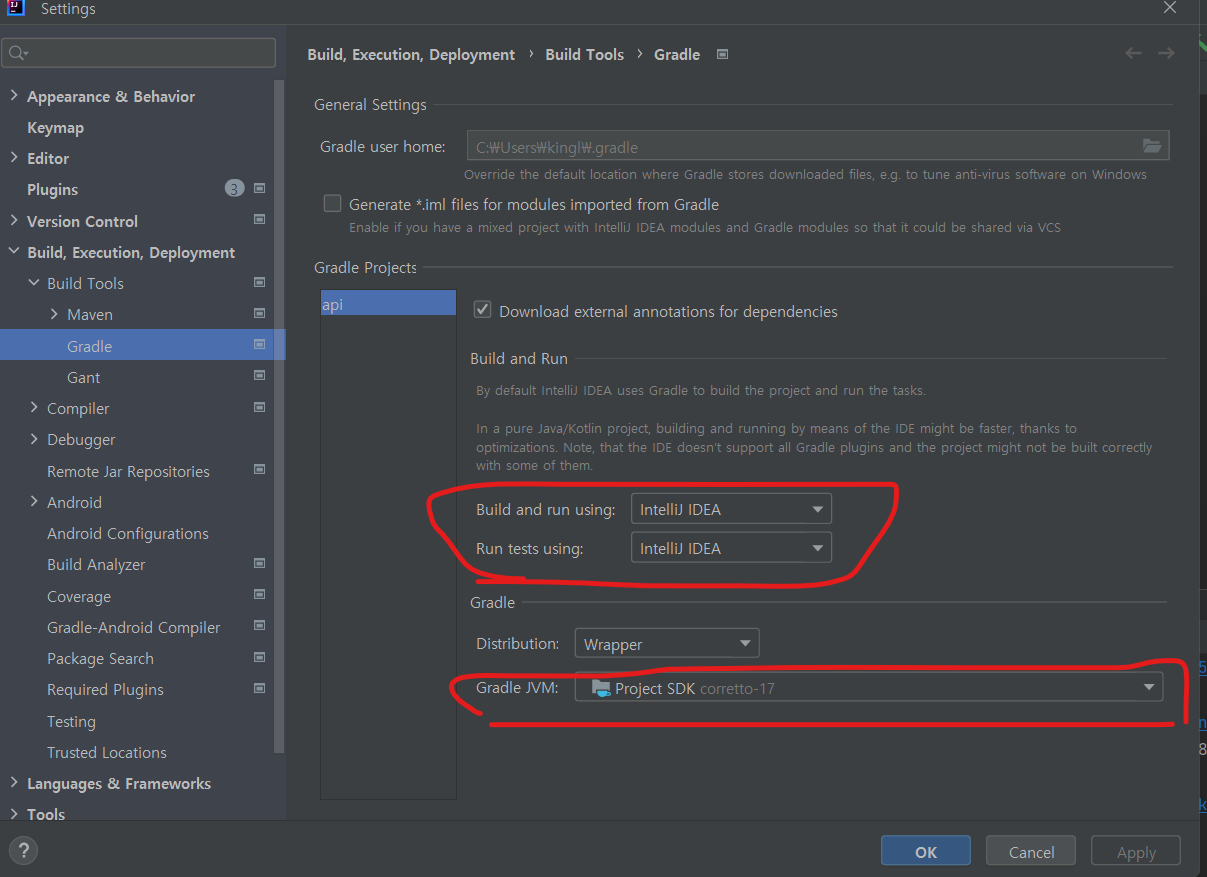 1. Build and run using과 Run tests using이 Intellij IDEA로 되어 있는지 확인한다.