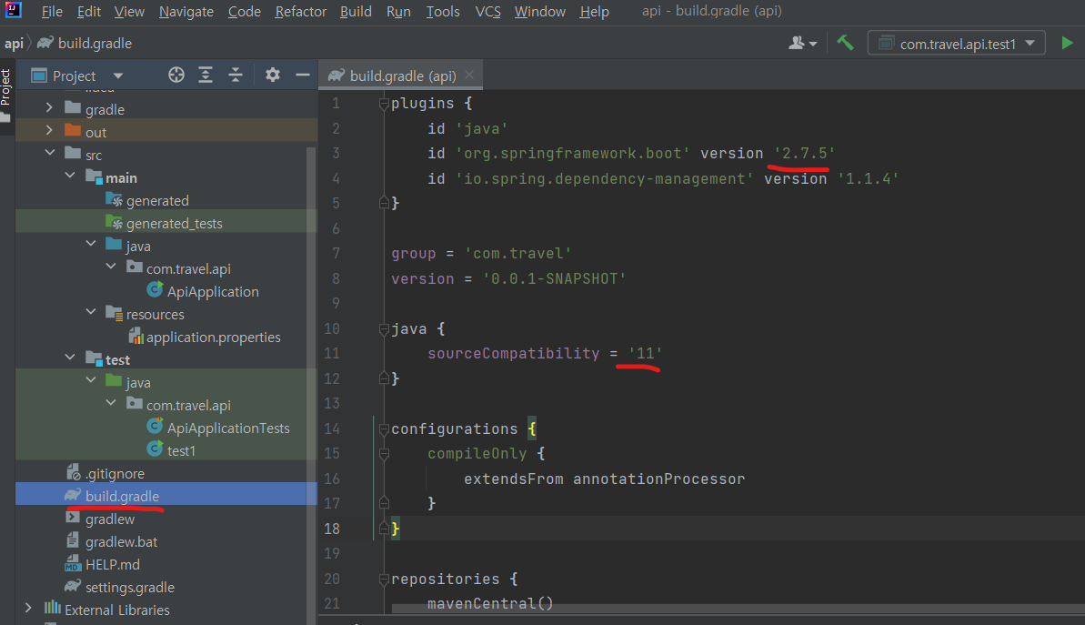그래서 build.gradle에서 2.7.5 버전으로 낮추어 주었고, java 버전은 그에 따라 11버전으로 낮추어 주었다.
