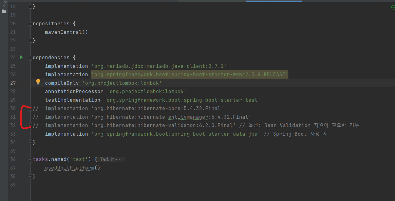 그래서 gradle에서 아래와 같이 implementation 'org.springframework.boot:spring-boot-starter-data-jpa'만 남겨두고,