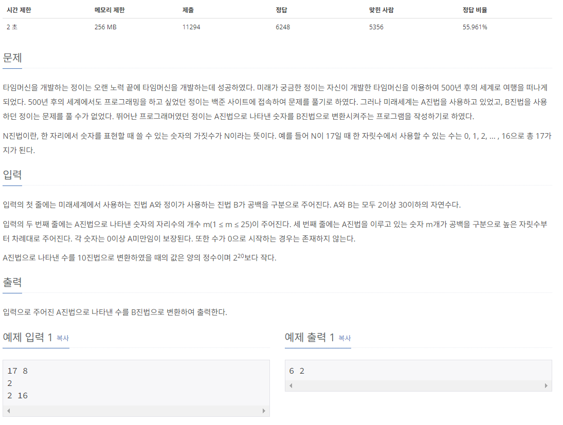마지막 줄에 주어진 A진수를 B진수로 출력하는 문제였다.
