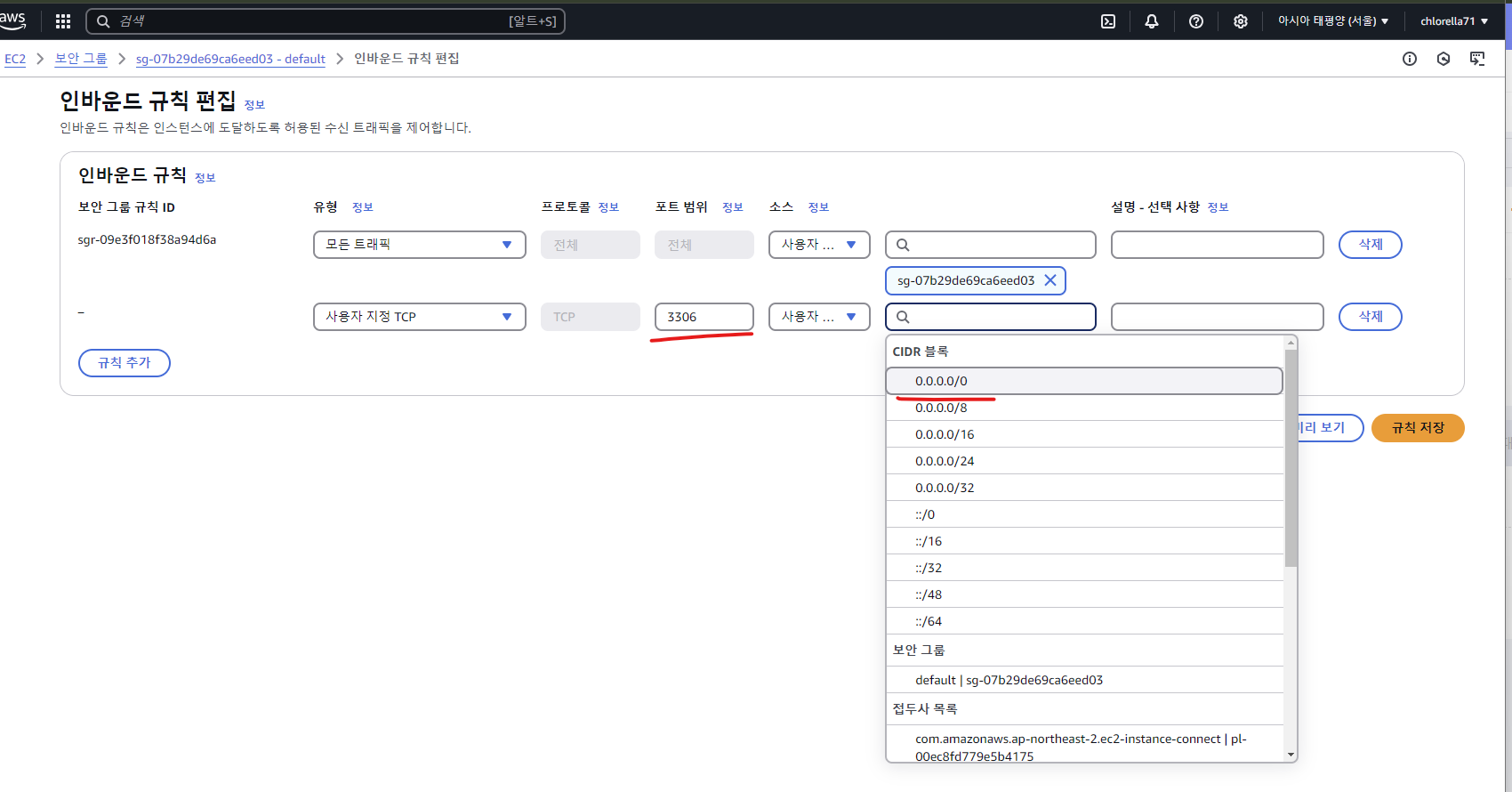 5. [규칙 추가] 버튼 클릭 후 포트 범위에는 DB의 포트, CIDR 블록은 0.0.0.0/0 선택