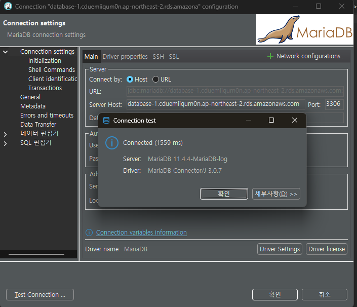 7. 데이터베이스 정보 입력 후 [Test Connection] 버튼 클릭하여 데이터베이스 접속 확인