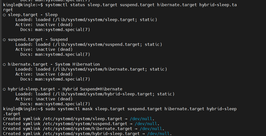 $ sudo systemctl mask sleep.target suspend.target hibernate.target hybrid-sleep.target