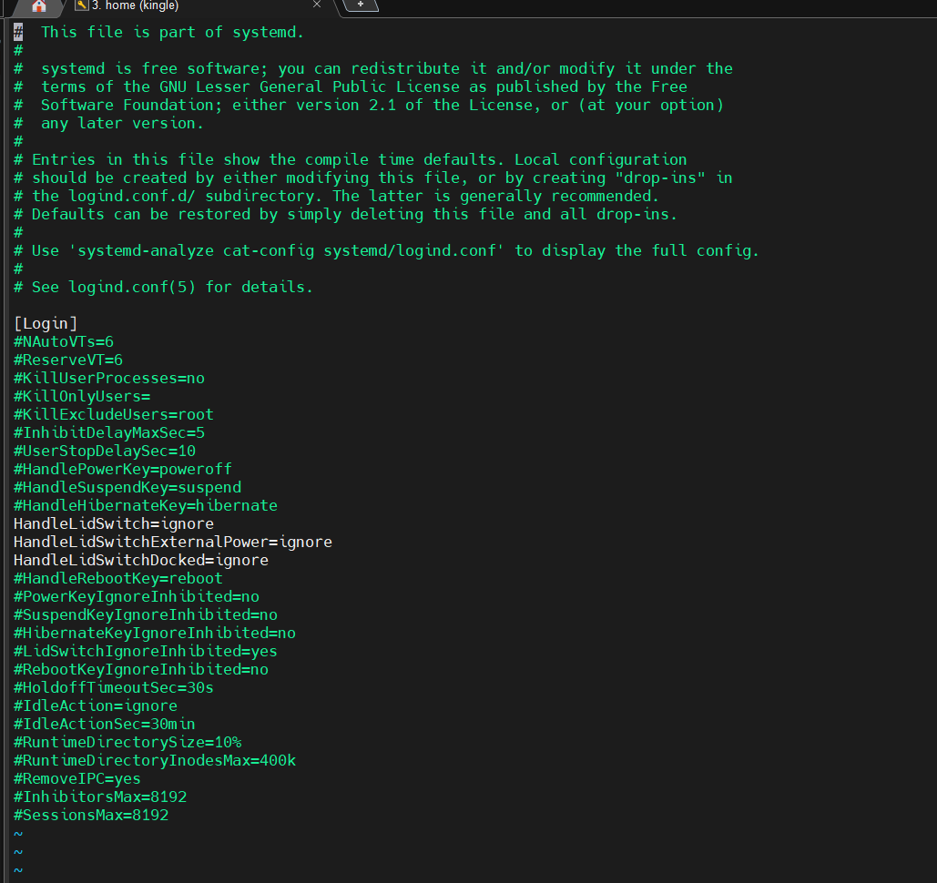 #HandleLidSwitch=suspend 이라고 되어 있는 부분들을 HandleLidSwitch=ignore으로 변경해준다.